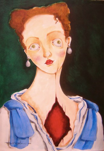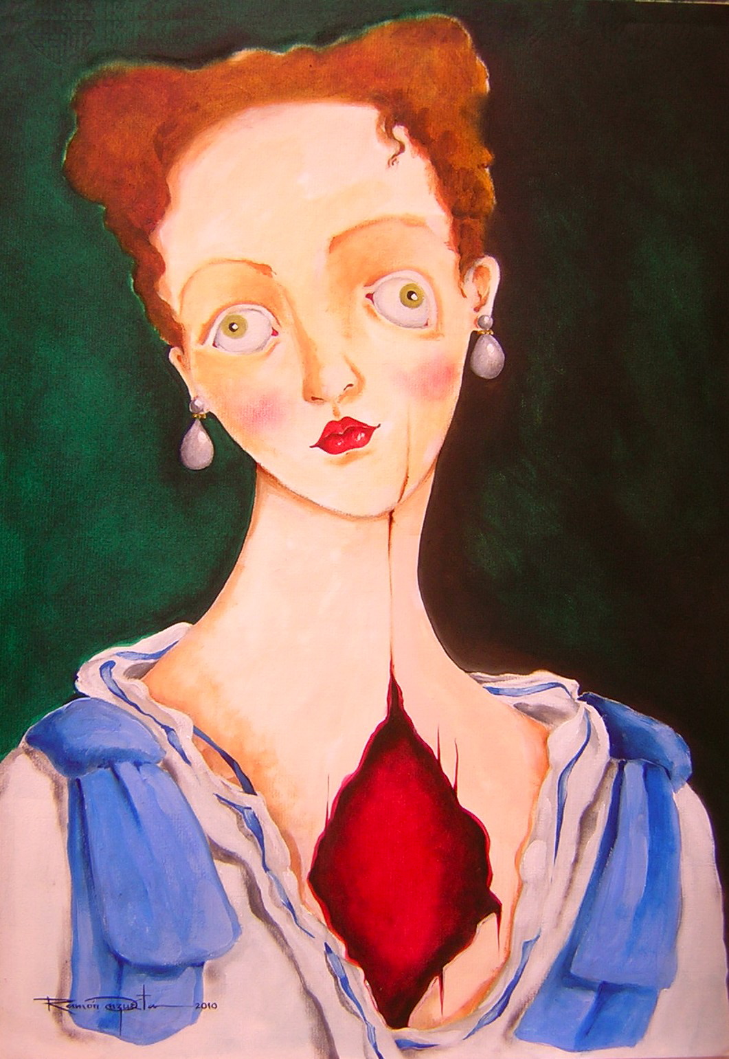 «Este es uno de los cuadros más impresionantes de Rami, aunque él tiene muchos de igual “pegada”. Es como un Sagrado Corazón de Jesús, pero en versión femenina, como era de esperarse en un cultor del universo de las mujeres. Sin embargo, a pesar del dolor que pueda destilar, hay en esta imagen una condensación de la dignidad humana que grita “Sólo está vencido aquel que confiesa estarlo”. Los aretes de puro lujo, el “busca novio” discreto sobre la frente, los lazos que, como charreteras de general, adornan el vestido que se intuye majestuoso, los labios rojos y sensuales que esbozan un beso… Nada indica que sea sangre de vencida lo que late en este pecho abierto, sino más bien es sangre generosa que brotando como lágrima se transforma en manantial de humanidad. Y, claro, están esos ojos, esa mirada conmovedora y vital que es el centro de la composición de esta mujer rota, pero entera, desafiante, lista para luchar en el laberinto de la vida. La perfección técnica es el maridaje perfecto con la intención indagadora: la daga desgarra el continente del cuerpo y deja ver el rojo de la pasión. Si alguien ha dudado alguna vez de la maestría de Ramón Unzueta aquí está esta otra prueba de su valencia trascendental. Yo siempre he creído en él y me da una alegría tremenda haber podido ver su crecimiento y su gloria. Gracias a ti por ser su musa, su alma y su ángel maternal.