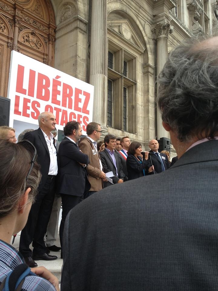Hoy participé en el acto de solidaridad con dos periodistas franceses rehenes en Siria: Didier François y Edouard Elías. Tomaron la palabra varias personas, entre ellas la adjunta del Alcalde de París y candidata a la Alcaldía de París, Ana Hidalgo. Estuvo presente la Primera Dama de Francia, Valérie Trierweiler.