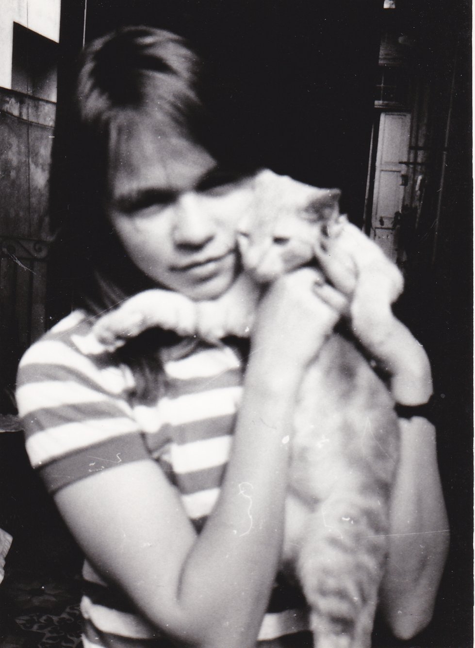 Con mi gata Tristeza, una foto que le mandé a Álvaro Mutis y le gustó mucho, más por el nombre de la gata que por la gata y la foto misma. He tenido varias gatas y gatos y animales en mi vida, la gata Sibila y mis perritos Coqui y Gnossis han sido mis preferidos, pero Tristeza, tan fea y arisca, la pobre, ocupó un espacio importante en mi corazón: