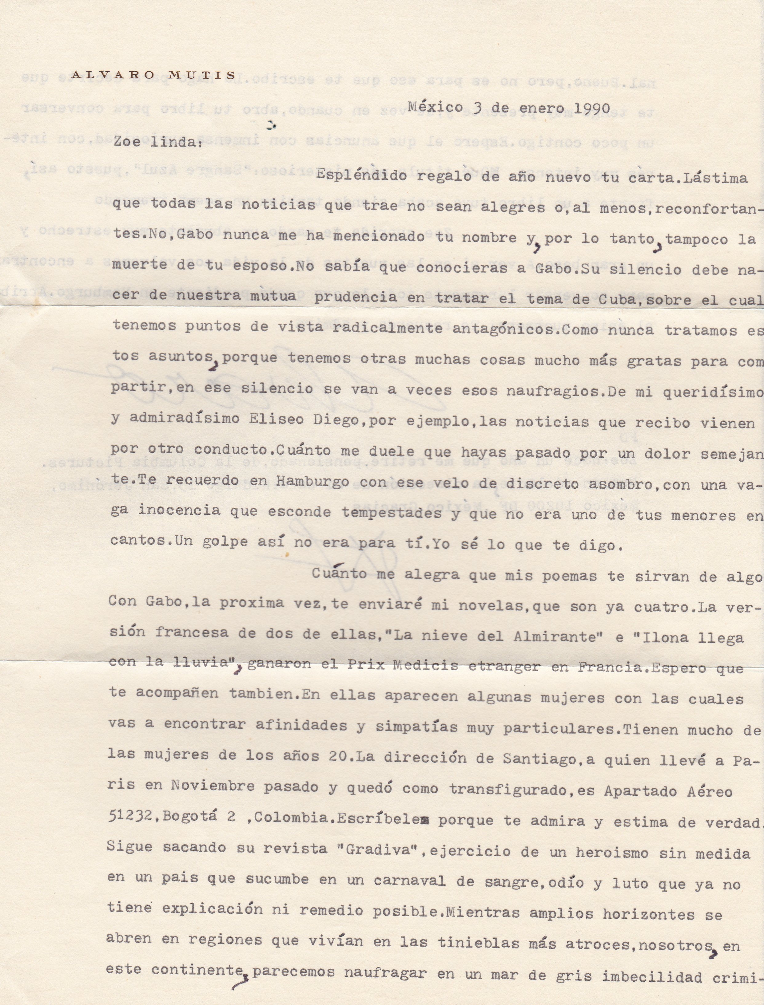 En la siguiente carta, tras la muerte de mi segundo esposo, José Antonio González, en un accidente de avión, el 3 de septiembre de 1989 en La Habana, y mi insistente demanda a personalidades y a todo el mundo, entre ellos al escritor colombiano García Márquez de que se hiciera público el contenido de la Caja Negra del avión, le escribí a Álvaro Mutis preguntándole si García Márquez le había hablado del tema, y por supuesto, no lo había hecho. Nunca pertenecí al círculo de amigos de García Márquez en Cuba, ni fui cercana a él. Lo conocí, por supuesto, durante sus visitas al Festival de Cine de La Habana, y las presentaciones de sus libros en lugares públicos. Durante el festival de cine de diciembre de 1989 le pedí al novelista colombiano, en medio de la recepción de clausura del Festival, una explicación acerca del accidente de ese avión, en el que se decía viajaría Raúl Castro y que el accidente no había sido otra cosa que un sabotaje, lo contrario no se ha comprobado todavía. En esa misma recepción sostuve una polémica personal con Fidel Castro, que he narrado en mi libro La Ficción Fidel. Es la razón por la que Mutis me habla de Gabo en su carta, porque yo misma le pregunté en una mía si le había contado lo ocurrido.