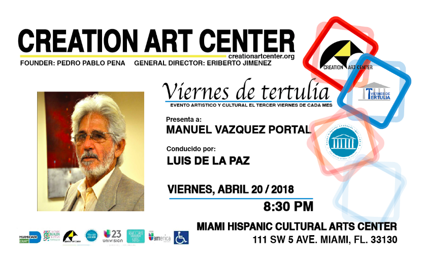 Viernes de Tertulia tendrá su próxima actividad el viernes 20 de abril del 2018, a las 8:30 de la noche, en el 111 SW 5ta. Avenida, con la participación de Manuel Vázquez Portal. Más información en el (305) 786 747-1877.