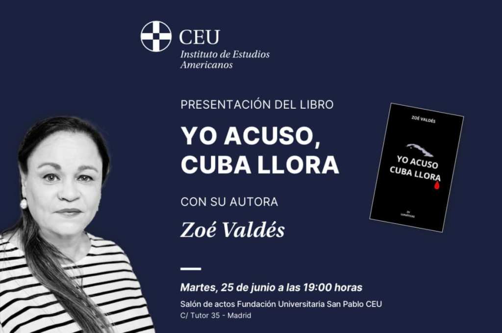 Por Redacción ZoePost. Presentación en Madrid del libro ‘Yo acuso, Cuba llora’, de Zoé Valdés. Martes 25 de junio a las 19:00 en el Salón de Actos de la Calle Tutor 35 de CEU.